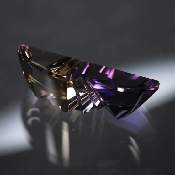 Another superlative gem beautifully designed around the color separation of this instantly recognizable material. A simply magnificent stone that is finished to perfection - by the true patriarch of the family no less. As the carving is the principal focus in any Munsteiner gem, it is interesting to have the added element of a naturally bi-color gem material - the resulting work ends up being even more dramatic. Absolutely one of the finest, most saturated Ametrine we have been able to offer from the family - a 100% museum quality stone. As the principal developer of fantasy cut stones, the heritage of a gem cut by Bernd Munsteiner is without compare - always a great rarity and a pleasure to handle one of these. With complete certificate from Atelier Munsteiner.