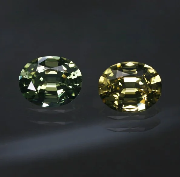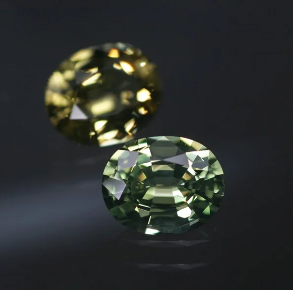 Absolutely one of the coolest of these ‘mismatched’ pairs that we have offered - both stones likely not being the first guess based on color. The gorgeous Chrysoberyl is a very saturated green, not terribly far from what some dealers would call a ‘vandium’ stone. And the Danburite is an unusually saturated and rare variety as well, this color having been found only sporadically in Tanzania in the last few years. The back that the Chrysoberyl is also Tanzanian is a nice conversation point. The cutting here is simply beyond - all facets/reflection match perfectly and they are a sight to behold in-hand. A gorgeous and rare set that would be almost impossible to replicate.