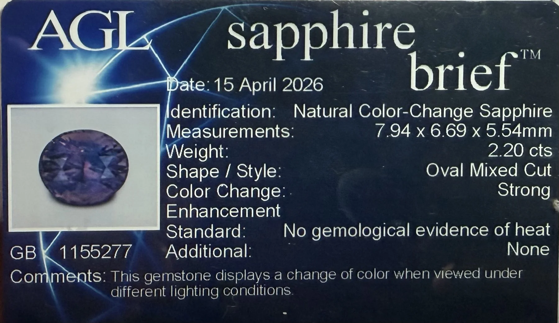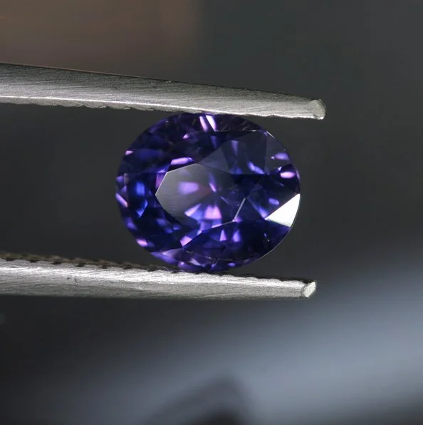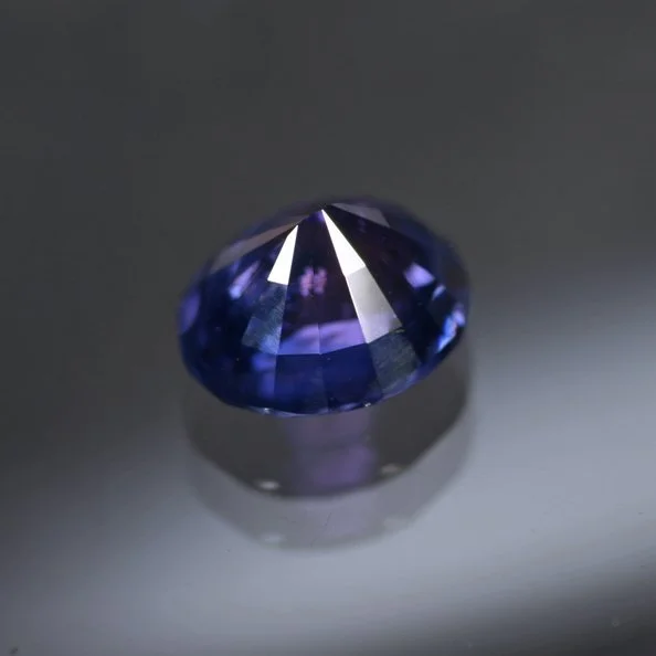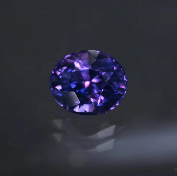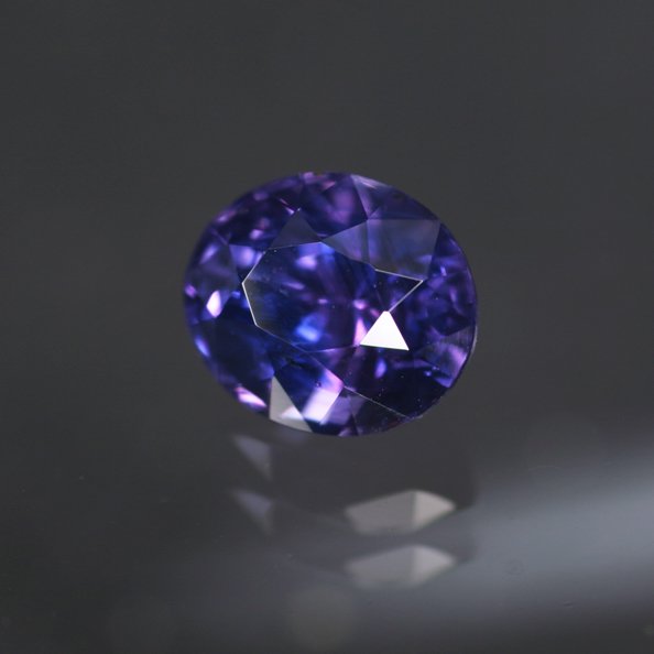 The face-up mixing of color is remarkable - it is akin to viewing a color change-only gem under multiple lighting conditions concurrently. It seems the bluish-violet is near the center while most of the purple surrounds the oval outline. Gorgeous cutting, perfectly clean, unheated, and 2+ carats are all assets here, before we even get to discussing the absolutely unique color behavior. A special Sapphire indeed.