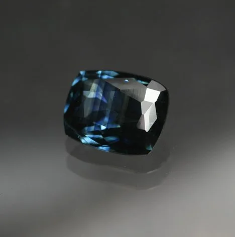 Barely detectable face-up, we simply couldn’t resist the unique look of this one. The bodycolor is entirely due to a series of colorless/dark blue zoning bands that run through the gem. Usually seen as a detriment, such zoning can be intensely interesting and quite appealing, as is the case here. Overall, the gem has dark slightly greenish blue color. Good size and not overly costly.