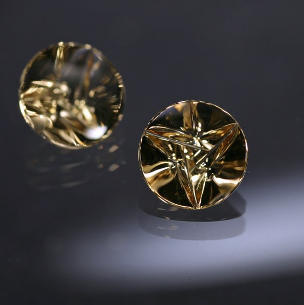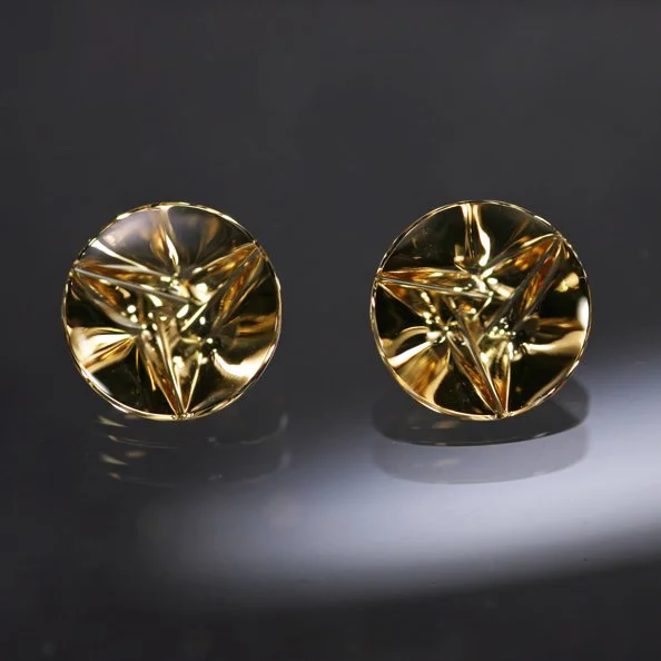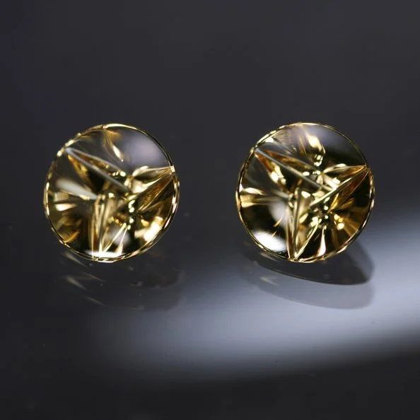 We did not get the opportunity to offer a great deal of fine Golden Beryl by the late Tom Munsteiner. We never saw much and the cost was always considerable given the greater rarity of the top quality material. Even more uncommon were matched pairs, so here is a lovely set of type we wish there could be more of - superb color and fine original Munsteiner ‘Apollo’ design. A saturation and depth of color that just is not same as any other material. Finished as you might expect with a superb polish. With full certificate from Atelier Munsteiner.