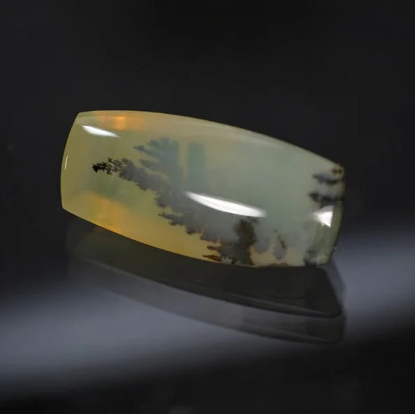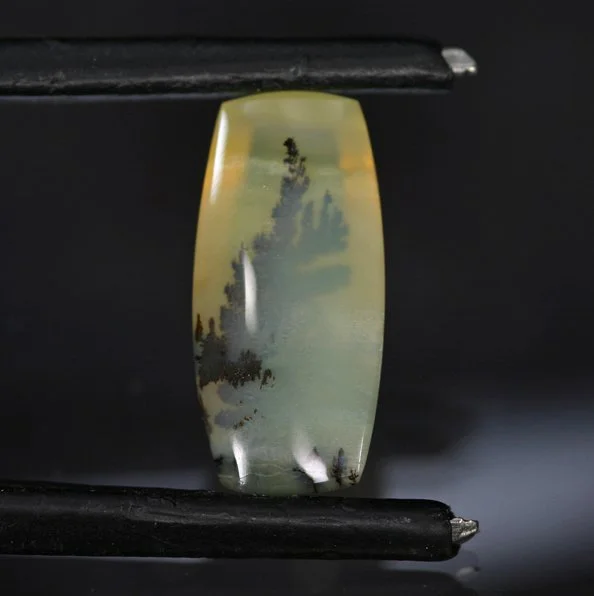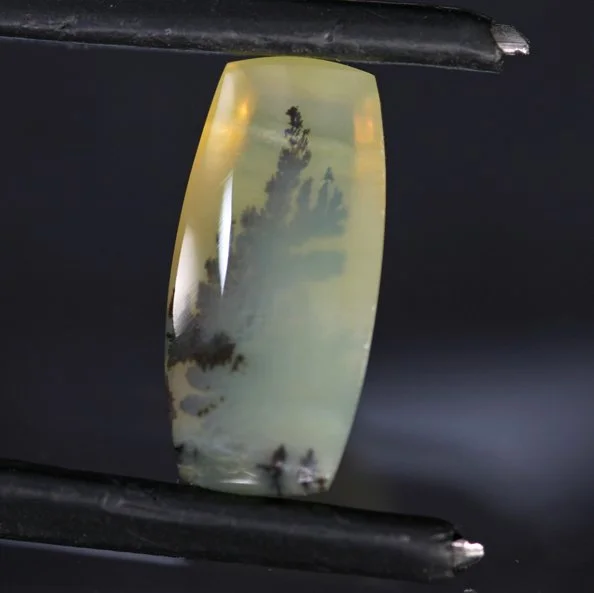 There really are some lovely Opals coming from Tanzania; stones with a bright yellow bodycolor, some degree of chatoyancy and some that have fascinating dendritic like inclusions. Quite occasionally when sorting through a parcel of this material, you can find a stone that combines all three of these characteristics into one very unique and wonderful piece. We admit to making up the name ‘landscape’ to describe these, but it is at least as apt as many names floating around the market. This lovely stone, in any light, has a fine dendritic pattern that it reminiscent of a moody forest landscape. But the real treat is the moderate chatoyancy that comes alive when the stone is in motion. Suddenly you add a layer of fog or low clouds to the landscape. Lovely effect and a fine stone.