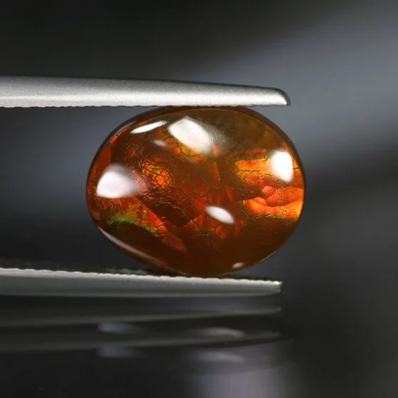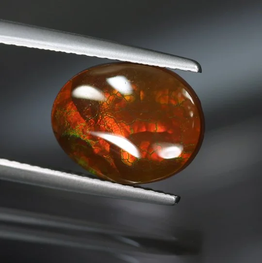 A resplendent example of a truly fine Arizona Fire Agate. There is a huge variation in quality among this material - most has a decent degree of spectral colors but only occasionally do you see a smaller stone with such a stunning display. Beautifully polished with low-slung undulations and a superb green-through-red veining that looks more like Ammolite than Fire Agate. Excellent colors, useable size, a rarer pattern and from the most famed of Arizona localities!