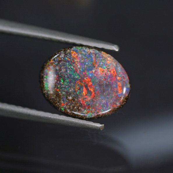 A gorgeous and extremely high quality example of Australian Boulder Opal. In terms of color coverage and full spectral display this one simply could not be any better. The colors are remarkable and need almost no additional lighting to be at full strength. Even more, the lovely Ironstone matrix is just below the surface and effortlessly provides a wonderful background to the colors. While the face is flat, the reverse is domed like a low cab - it is rather endearing how much the reverse looks like a coffee bean, so much so that it could be mounted to rotate and reveal its surprise. Lovely, lovely gem.