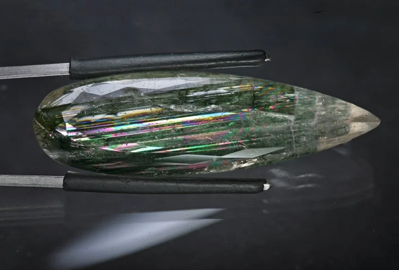 Tourmaline in Quartz is probably one of the widest know and most available of inclusion focused gems. There are many of these from Brazil with Tourmaline in a variety of colors. This gem has two interesting characteristics, the first being the green Tourmaline crystal is exceedingly wide and very transparent in its own right. More often than not, the Tourmaline is rather thin.