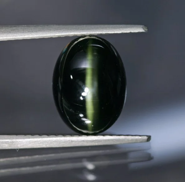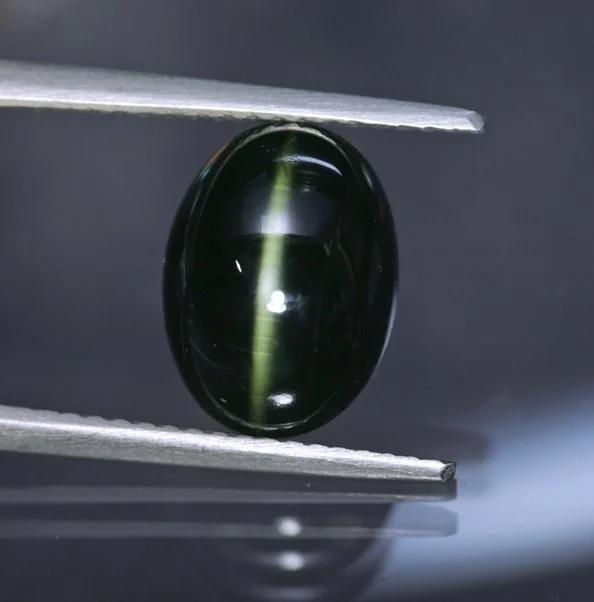A rather large and fine example of this chatoyant Enstatite. The real attraction with these is the color - an underappreciated and lovely exceedingly deep green that lightens up near the eye. We don’t often see these in good quality in larger sizes - nice polish and a very defined eye as well.